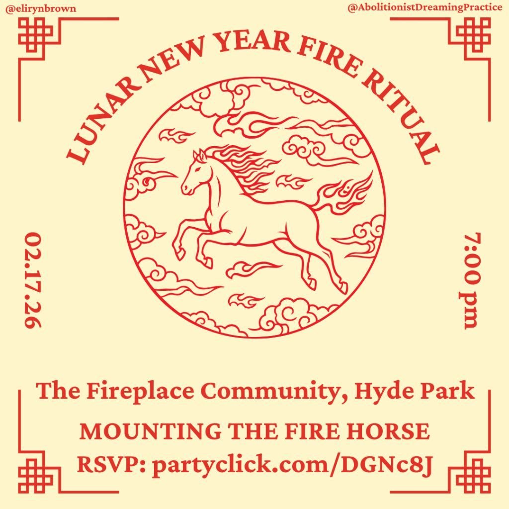 Please join Eli Ryn Brown back at The Fireplace in Hyde Park for this annual Lunar New Year Fire and Celebration! We will welcome the year of the Fire Horse and observe the new moon + solar eclipse with a big bonfire, warming tea and snacks, and a communal ritual. As always, folks who attend will be treated with handmade blessings and charms made by Ryn! RSVP: https://partyclick.com/DGNc8J